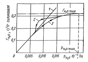 Рис.8.14. Зависимость адсорбции силикагелем водяного пара от его парциального давления при Т=293К: 1- по уровню адсорбции Генри; 2- путь десорбции; 3- путь адсорбции.