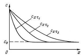 Рис.8.16. Изменение концентрации диффундирующего вещества в зависимости от расстояния до поверхности постоянного источника диффузии для различных моментов времени после начала действия источника.