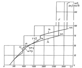 Рис.8.3. Зависимость приращения энтропии от температуры для Al и Fe.