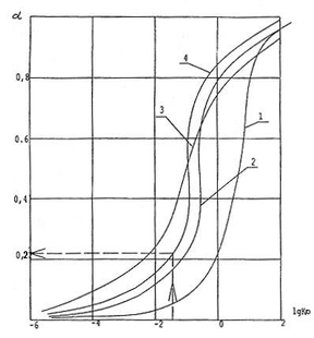 Рис.8.8. Номограмма для графического определения степени диссоциации α в типовых реакциях термической диссоциации двух- и трехатомных газов: 1- (Кр+4)α2-Кр=0; 2- (Кр+1)α2-Кр=0; 3- (Кр+4)α3-3αКр+2Кр=0; 4- 4(Кр+4)α3-3αКр-Кр=0.