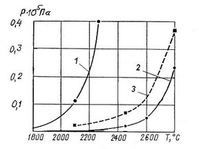 Рис.8.10. Соотношение парциальных давлений паров Mn(2), Fe(2) и сплава Fe-5% Mn (3) при высоких температурах.