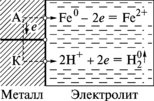 Рис. 8.18. Схема коррозионного взаимодействия электролита с поверхностью ме-талла: переход ионов Fe в электролит на аноде А, сое-динение ионов H+ с элект-