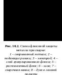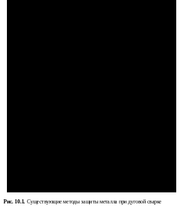 уществующие методы защиты металла при сварке плавлением приведены на рис. 10.1. Они практически реализуются в различных сочетаниях при различных способах сварки, известных в настоящее время. Широко применяются четыре основных вида защиты зоны сварки: 1) флюсовая защита; 2) газовая защита; 3) газошлаковая защита; 4) вакуумная защита.
