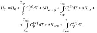 Рассмотрим изменение энтальпии реальных веществ, в которых могут совершаться фазовые превращения. Теплоемкость таких веществ зависит от температуры и скачкообразно изменяется в момент фазового перехода. Запишем в общем виде с учетом (8.7) уравнение для расчета энтальпии реального вещества, имеющего три агрегатных состояния (твердое, жидкое, газообразное и одно фазовое превращение в твердом состоянии из одной кристаллической модификации в другую