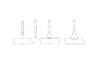 При замыкании капли под током резко падает сопротивление дуги, напряжение становится равным нулю. Пропорционально возрастает ток.