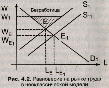 Увеличение предложения на рынке рабочей силы вызывает перемещение кривой предложения из положения S1 в положение S11 вправо вниз. Установится новое равновесное состояние рынка в точке E1. График иллюстрирует и иную (более низкую) заработную плату We1.