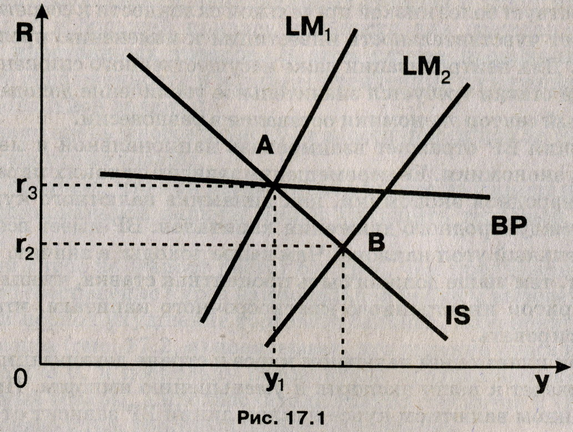 При плавающем валютном курсе в стране девальвация валюты приведет к росту экспорта и уменьшению импорта. При фиксированном валютном курсе наклон линии ВР зависит от уровня открытости страны с точки зрения международного движения капитала. В случае, когда введено полное ограничение вывоза-ввоза капитала из страны линия ВР будет вертикальна. Это же означает, что процентная ставка внутри страны отличается от процентной ставки на мировом рынке капиталов. При отсутствии каких-либо ограничений на перемещение капитала линия ВР будет горизонтальной. При повышении внутренней процентной ставки будет происходить приток капитала из-за рубежа до тех пор пока внутренняя процентная ставка не будет равна среднемировой.