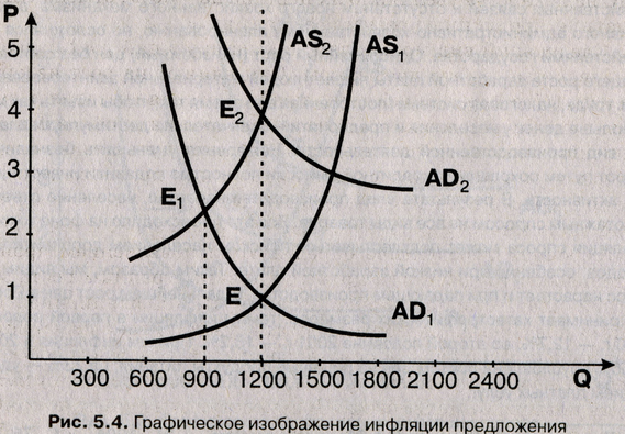 Повышение (см. рис. 5.4) цены предложения (издержек производства) смещает кривую предложения AS1 вверх и влево в положение AS2, в итоге спрос и предложение балансируются в точке большей цены и меньшего Q (ВНП). Чтобы восстановить бывший Q, правительство должно стимулировать спрос, потом может повториться весь процесс. Если правительство не пытается влиять на спрос при инфляции предложения, то возможен спад, если же оно пытается поддержать полную занятость стимулированием спроса, то вероятно появление инфляционной спирали.