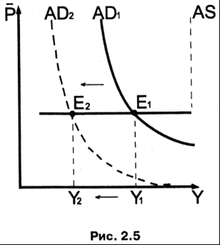 ак видно из рис. 2.5, если кривая спроса сдвигается влево, то выпуск продукции падает. Он мог бы сохраниться в прежнем размере (как в предыдущей модели) за счет снижения цен. Однако если колебания цен не происходит, то возможен достаточно длительный спад производства, что и происходило в годы Великой депрессии. Модель иллюстрирует то положение кейнсианской концепции, что объем предложения, или реальный объем производства, который предприниматели будут поддерживать, определяется спросом, следовательно, можно утверждать, что снижение совокупного спроса (от AD1 к AD2 на рис. 2.5) приведет к уменьшению реальных объемов производства (от Y1 к Y2).