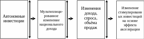 Из данной схемы ясно, что автономные инвестиции вызывают действие эффекта мультипликатора, что способствует росту дохода. Следующий за этим рост спроса и объема продаж ведет к появлению стимулированных инвестиций и действию эффекта акселератора.