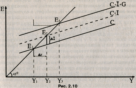 На графике (рис. 2.13) показано, насколько совокупные расходы меньше тех, которые обеспечили бы объем производства на уровне полной занятости. Дальнейший спад расходов может привести к спаду производства, причем с мультипликационным эффектом. Выходом из подобной ситуации может быть стимулирование спроса, и прежде всего такой его составляющей, как инвестиции.
