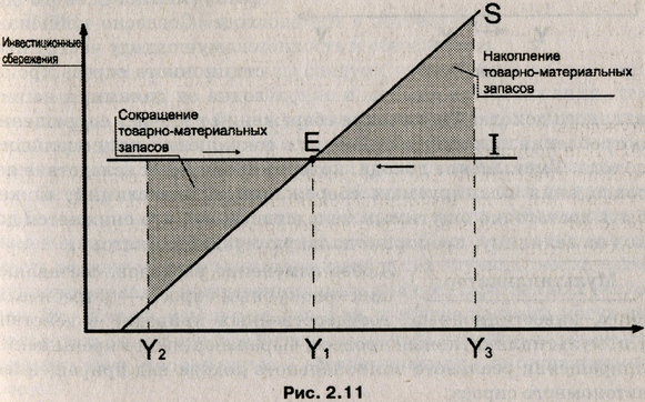 При объеме производства больше равновесного (Yi) превышение уровня сбережений, который ожидают производители, означает сокращение потребления и как следствие, снижение фирмами производства и выпуска продукции. Аналогично нестабильной будет и противоположная ситуация — сокращение сбережений ведет к увеличению объема выпуска.