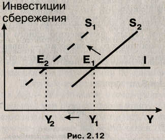 Данная модель может быть использована для иллюстрации так называемого «парадокса бережливости». Традиционно принято считать, что увеличение сбережений благоприятно сказывается на экономическом положении как отдельных граждан, так и страны в целом. Кейнс обратил внимание на то, что при определенных условиях увеличение сбережений может приводить к нежелательным последствиям для экономики. Если население увеличивает сбережения (сдвиг кривой сбережения влево-вверх), то при прочих равных условиях сокращается потребление и совокупный спрос, а следовательно, и равновесный объем производства. Это, в свою очередь, означает снижение дохода, и желание увеличить сбережения не окажет в конечном итоге влияния на их величину. Фактический уровень сбережений может и не измениться (рис. 2.12).