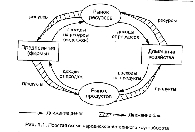 омашние хозяйства поставляют на рынок ресурсов факторы производства, где их приобретают фирмы. В ходе производства фирмы используют факторы производства в качестве ресурсов и с их помощью выпускают готовые изделия, которые затем поставляются на рынок продуктов. Домохозяйства в свою очередь на доходы от реализации факторов производства приобретают на рынке продуктов готовые изделия и тем самым получают предметы потребления, необходимые для жизни. Фирмам же доходы от продаж дают в руки денежные средства, позволяющие вновь закупить ресурсы и продолжить производственную деятельность. Таким образом осуществляется процесс воспроизводства: и фирмы, и домохозяйства постоянно получают из кругооборота как материальные средства для своего существования и развития, так и деньги, необходимые для их приобретения на рынке.