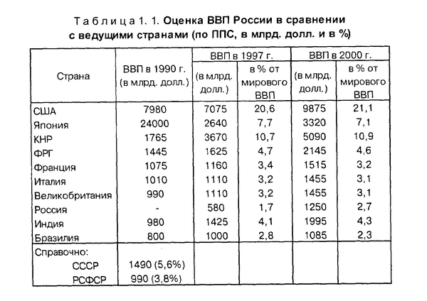 одной стороны, в настоящее время ВВП России по абсолютным масштабам заметно уступает всем ведущим развитым странам и ряду крупных развивающихся. С другой стороны, данные за 2002 г. показывают, что в стране существует значительный экономический потенциал, и после преодоления трансформационного кризиса Россия вполне может занять 5—6 место в мире по объемам производства.