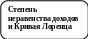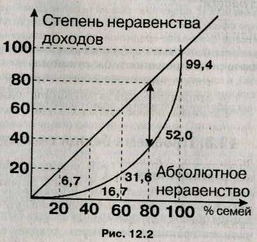 «Доля населения» будет располагаться на оси абсцисс, а «доля дохода» на оси ординат (рис. 12.2). Теоретическая возможность абсолютного равенства в распределении доходов представлена биссектрисой. Она указывает на то, что любой данный процент семей получает соответствующий процент дохода. 20% семей получают 20% дохода, 40% — 40% дохода и т.д.