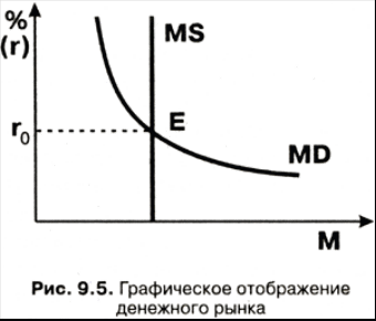 целом денежный рынок может иметь следующее графическое отображение (рис. 9.5). На рис. 9.5 точка Е находится на пересечении кривых спроса и предложения денег и определяет «цену» равновесия на денежном рынке. Это равновесная ставка процента, то есть альтернативная стоимость хранения не приносящих проценты денег. Равновесие на денежном рынке является подвижным, то есть оно постоянно меняется под воздействием ряда факторов. Представим, что меняется предложение денег, а спрос на деньги остается постоянным.