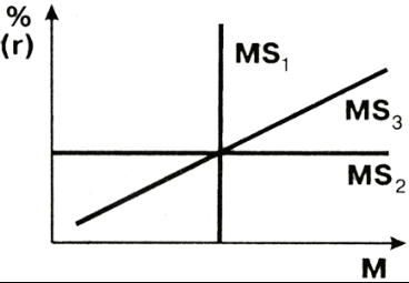 Рис. 9.1. Денежное предложение при различных целях денежно-кредитной политики, где MS1 — денежное предложение при монетарной политике, направленной на поддержание неизменной массы денег в обращении; MS2 — денежное предложение при гибкой денежно-кредитной политике; MS3 — денежное предложение при допущении изменения и массы денег в обращении, и ставки процента