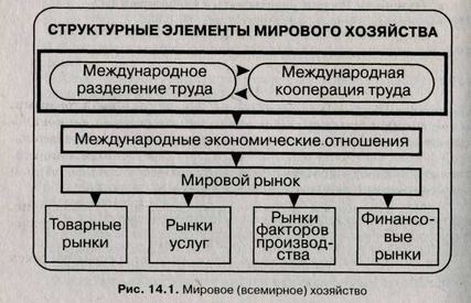 М ировое хозяйство - это противоречивая целостность националь­ных хозяйств, связанных между собой международными эконо­мическими отношениями (МЭО) на основе международного разде­ления труда (МРТ) (рис. 14.1). Международные экономические отношения характеризуют способ и характер взаимодействия всех стран мира в сфере хозяйственного общения. В основе функ­ционирования мирового хозяйства с его МЭО лежит международ­ное разделение труда, т.е. специализация стран на определенных видах товаров и услуг, которая предполагает их устойчивый меж­дународный обмен или кооперацию.