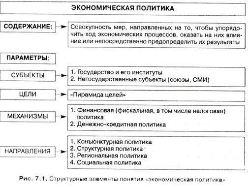 Подытоживая сказанное, отметим, что экономическая политика — многоплановое явление, охватывающее целый ряд параметров. Чтобы достаточно полно усвоить эту категорию, необходимо четко и наглядно представлять себе совокупность всех взаимосвязанных компонентов: субъектов (осуществляющих проведение данной политики), ее целей, механизмов их реализации и, наконец, направлений регулирующих мер государства (рис. 7.1).