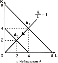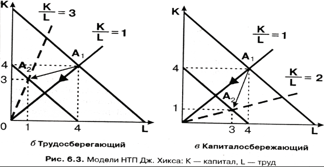 бщепризнанной является модель технического прогресса английского экономиста, лауреата Нобелевской премии Джона Хикса. В своем анализе он рассматривает два фактора экономического роста — труд и капитал, и выделяет три типа научно-технического прогресса: нейтральный, трудосберегающий и капиталосберегающий. Нейтральный НТП основан на таких технологиях, которые одновременно и в равной мере сберегают труд и капитал (рис. 6.3, а). При трудосберегающем НТП обеспечивается большая производительность капитала, чем труда (рис. 6.3, б). В случае капиталосберегающего НТП в большей степени растет производительность труда, чем капитала (рис. 6.3, в).