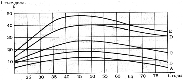 За базовый принят доход человека с неполным средним образованием (кривая «А»). Уже при росте сроков образования в 1,15 раза среднедушевой доход увеличивается в годы пик (возраст 40—55 лет) в 1,5 раза (кривая «В»). Дальнейшее увеличение продолжительности образования в 1,7 раза приводит к повышению максимальной величины среднедушевого дохода более чем в 2,3 раза (кривая «С»), И, наконец, рост сроков обучения по сравнению с базовым уровнем в 2,14 раза и в 2,42 раза приводит к росту «пиковых» доходов соответственно в 3,5 раза (кривая «D») и в 4 раза (кривая «Е»). Следует также отметить, что для лиц, получивших более серьезное и качественное образование, вместе с ростом их «пиковых» доходов в трудоспособном возрасте растет и средняя величина аннуитетов (ежегодных платежей), которые они получают после выхода на пенсию.