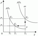 Точка Е3 - это равновесие при неполной занятости без повышения уровня цен, т. е. без инфляции. Точка Е1 - это равновесие при небольшом повышении уровня цен и состоянии, близком к полной занятости. Точка Е2 - это равновесие в условиях полной занятости, но с инфляцией.