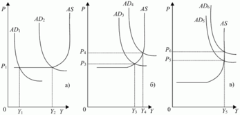 На кейнсианском отрезке (рис. 12.7 а), отличающемся высоким уровнем безработицы и большим количеством неиспользованных производственных мощностей, расширение совокупного спроса (от AD1 до AD2) приведет к увеличению реального объема национального производства (от Y1 к Y2) и занятости без повышения уровня цен (Р1). На промежуточном отрезке (рис. 12.7 б) расширение совокупного спроса (от AD3 до AD4) приведет к увеличению реального объема национального производства (от Y3 к Y4) и к повышению уровня цен (от Р3 до Р4).