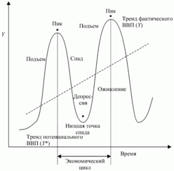 где Y – фактический ВВП; Y' - потенциальный ВВП; и - фактический уровень безработицы; и' - естественный уровень безработицы; ? - эмпирический коэффициент чувствительности ВВП к изменению циклической безработицы (коэффициент Оукена).