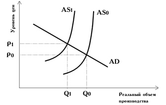 Инфляция предложения означает рост цен, спровоцированный увеличением издержек производства в условиях недоиспользования производственных ресурсов При негативной экономической конъюнктуре уменьшается предложение в экономике (рис. 2.2). Как правило, это связано с ростом цен на факторы производства. Издержки производства возрастают и перекладываются на цену выпускаемой продукции. Если эта продукция также является ресурсом для какой-либо фирмы, то и она вынуждена повышать цену. Другой вариант развития событий возможен, если из-за высокой эластичности спроса на товар предприниматель не может повысить цену. В этом случае его прибыль уменьшается, и часть капиталов из-за падающей доходности покидает производство и уходит в сбережения. Также факторами инфляции предложения могут стать высокие налоги, высокие ставки процента на капитал и рост цен на мировых рынках. В последнем случае дорожает импортное сырье, а соответственно, и отечественная продукция. Следует отметить, что в этом случае не только растут цены, но и уменьшается равновесный объем производства. Такая ситуация не противоречит утверждению, что экономика функционирует при полной занятости всех ресурсов, поскольку полная занятость предполагает использование всех факторов производства, предлагаемых по данной цене.