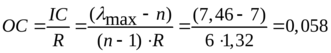 Степень корректности заполнения матрицы парных сравнений критериев и согласованности своих суждений ЛПР оценивает на основании отношения согласованности (OC), которое вычисляется по выражению (7)