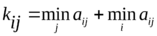 Находим минимальный элемент в каждой строке матрицы м вычитаем его из всех элементов этой строки. Минимальные элементы строк соответственно равны 1,0., а их сумма равна 1. Получаем матрицу: