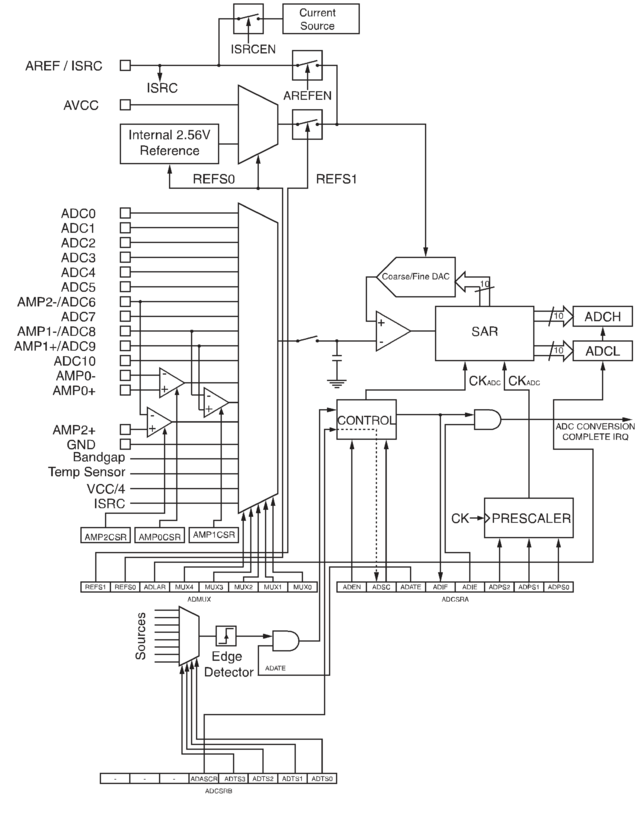 По завершении преобразования результат помещается в этих двух регистрах (ADCH и ADCL). При использовании дифференциального режима преобразования результат представляется в коде двоичного дополнения.