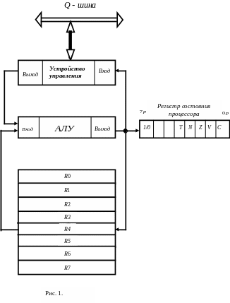Упрощенная структурная схема микропроцессора приведена на рис.1. Основными узлами процессора являются: арифметическо - логическое устройство (АЛУ), регистры общего назначения (РОНы), устройство управления (УУ) и регистр состояния процессора (РСП).