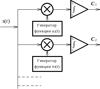 Основными элементами здесь являются генераторы тех базисных функций, по которым производится разложение. Анализируемый сигнал одновременно подается на совокупность множительных звеньев, осуществляющих перемножение этого сигнала и соответствующей базисной функции. С выходов перемножителей сигналы поступают на интеграторы.