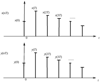 Для дискретной цепи вместо дифференциального уравнения должно быть записано разностное уравнение, где входной и выходной сигналы x(t) и y(t) задаются для дискретных моментов времени t=nT, а вместо производной dy/dt должна фигурировать разность соседних значений сигнала y(nT)-y(nT-T).