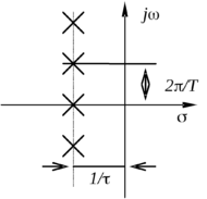 Единственному полюсу системной функции соответствует бесконечное число полюсов передаточной функции, расположенных вдоль прямой j с интервалом 2/T (см. Рис. 4 .2).