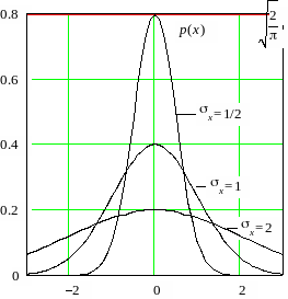 Функция p(x) симметрична относительно среднего значения. Чем больше x, тем меньше максимум, а кривая становится более пологой, при этом площадь под кривой p(x) равна единице при любых значениях x.