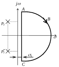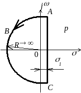 Добавлением к прямой (1-j, 1+j) дуги бесконечно большого радиуса можно образовать замкнутый контур интегрирования. Для того, чтобы добавление этой дуги не изменяло значения интеграла, нужно следовать правилу: при положительных значениях t контур должен быть расположен в левой полуплоскости переменной p, а при отрицательных t - в правой.