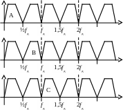 Коэффициенты Cn при этом являются уже выборками не заданного сигнала s(t), а некоторой другой функции, спектр которой ограничен наивысшей частотой m''<m. Так возникают частотные искажения дискретизации, известные как эффекты наложения спектров или алайзинга.