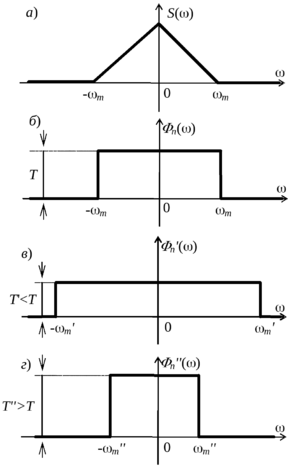 Если взять интервал T' между выборками меньше, чем T=/m, то ширина 2m' спектра n'() базисной функции n'(t) будет больше, чем ширина спектра S() (см. Рис. 3 .9 в).
