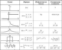 Лапласа совпадает с аналогичными свойствами преобразования Фурье. Спектральные плотности и изображения сигналов по Лапласу сведены в таблицу.