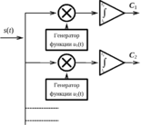 Основными элементами здесь являются генераторы тех базисных функций, по которым производится разложение. Анализируемый сигнал одновременно подается на совокупность множительных звеньев, осуществляющих перемножение этого сигнала и соответствующей базисной функции. С выходов перемножителей сигналы поступают на интеграторы.