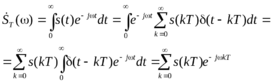Представление s(t) в форме Error: Reference source not found существенно упрощает спектральный анализ дискретных сигналов. Например, спектральную плотность Sт() можно определить непосредственно из совокупности временных отсчетов {s(kT)}, без обращения к спектру S() исходного континуального сигнала. Действительно, применив обычное преобразование Фурье (3.50)