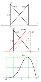 Например, построим (Рис. 3.54) взаимную корреляционную функцию для двух сигналов s1(t) и s2(t). Исходное положение сигналов при =0 показано вверху Рис. 3.54.. При сдвиге сигнала s2(t) влево (>0) корреляционная функция сначала возрастает, затем убывает до нуля при =T. При сдвиге вправо (<0) корреляционная функция сразу убывает. В результате получается асимметричная относительно оси ординат функция Bs1s2() (Рис. 3.54, внизу). Очевидно, что значение Bs1s2() не изменится, если вместо упреждения сигнала s2(t) дать задержку сигналу s1(t). Поэтому выражение Error: Reference source not found можно обобщить следующим образом: