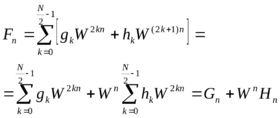 Однако, Error: Reference source not found справедлива только для nN/2-1, т.к. Gn и Hn не определены для больших n. Поэтому для nN/2 значение Fn вычисляются с использованием периодичности ДПФ: