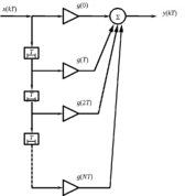 Формула Error: Reference source not found представляет собой алгоритм цифровой фильтрации. Если импульсная характеристика фильтра описывается конечным числом членов, то фильтр может быть реализован в виде схемы на Рис. 4.3.