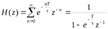 Это общий вид формулы для системной функции цифрового фильтра 1-го порядка. При a=1 и b=e-T/ она совпадает с полученным