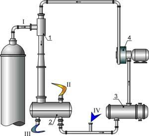 Откачиваемая среда из технологического аппарата, например, ректификационной колонны, направляется на вход вакуумсоздающего устройства 1. В вакуумсоздающем устройстве 1 происходит сжатие парогаза за счет энергии струи рабочей жидкости, подаваемой в аппарат 1 насосом 4. В качестве рабочей жидкости может быть использован один из технологических потоков установки, который допустимо смешивать с откачиваемыми вакуумсоздающим устройством парами.