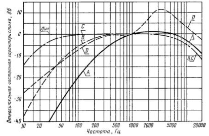 Корректированные уровни звукового давления (уровни звука). Существуют 4 частотные характеристики шумомеров (международные частотные корректирующие характеристики) А, В, С, D.